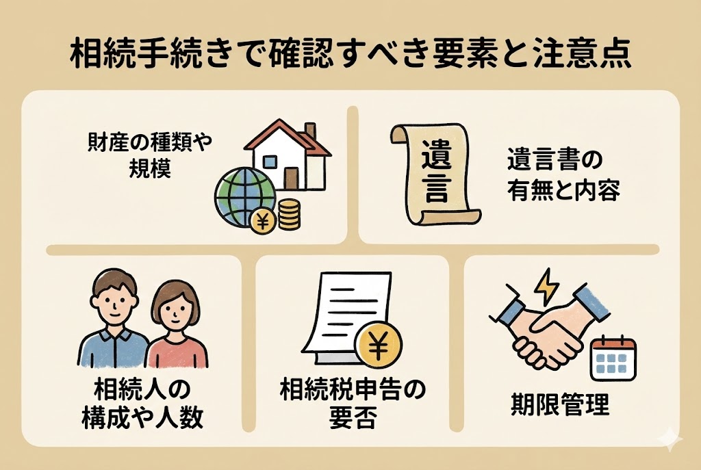 - 財産の種類・規模、相続人の構成や関係性、遺言書の有無、相続税の申告の要否が手続きの難易度を左右する。