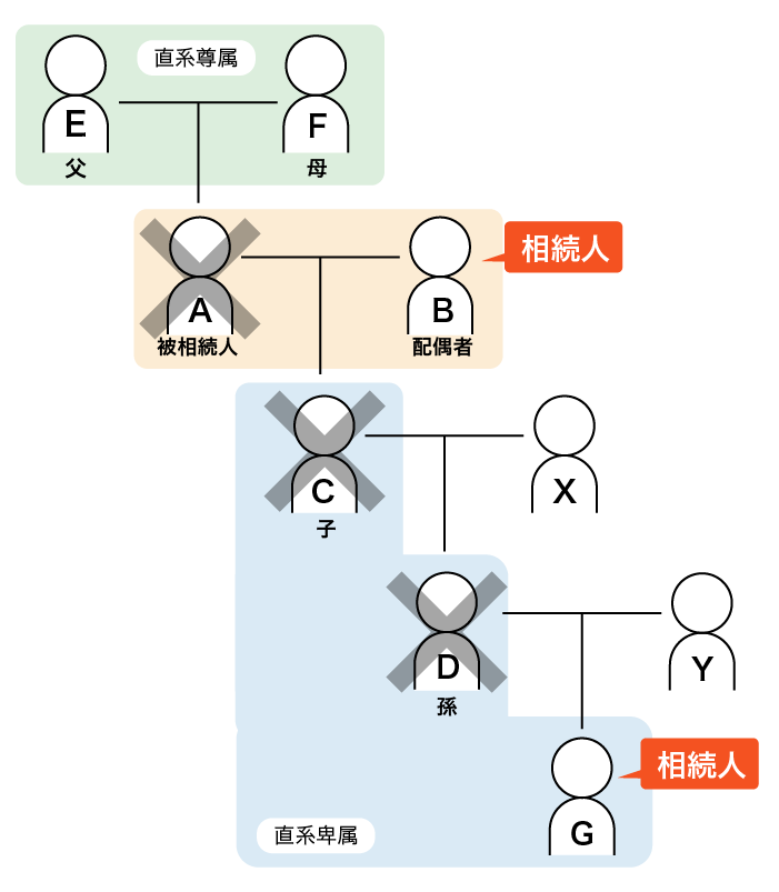 ○子Cは本来の相続人ですが、すでに死亡しているため、Cに代わって孫Dが相続人となります。さらに、そのDも死亡していることから、Dに代わり、ひ孫Gが相続人となります(再代襲相続)。
