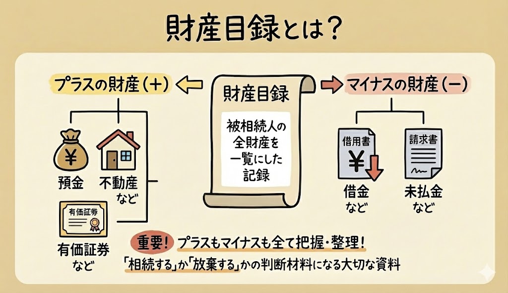 1. 財産目録は、プラスの財産(預金・不動産など)とマイナスの財産(借金など)を一覧に整理したもの。