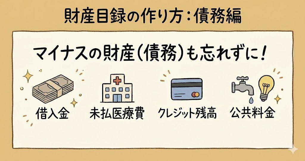 預金や不動産、有価証券などの「プラスの財産」だけでなく、借金や未払金などの「マイナスの財産」も含めて整理することが大切です。