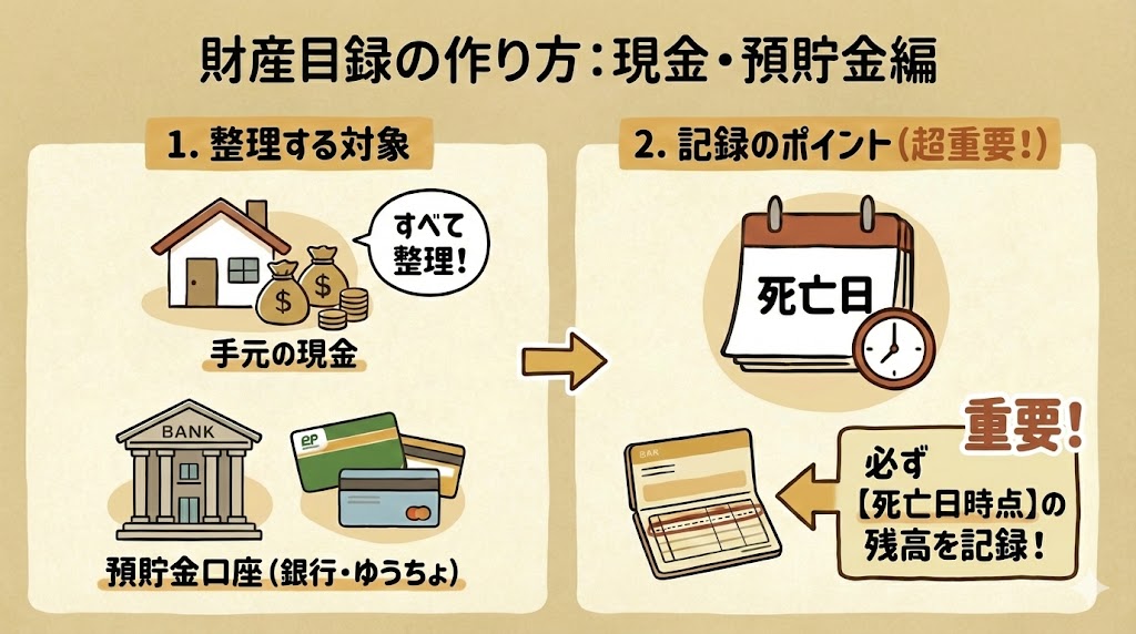 現金や預貯金は通帳の残高をそのまま記載できますが、不動産の場合は「死亡日時点での価値(評価額)」を算出して記録する必要があります。