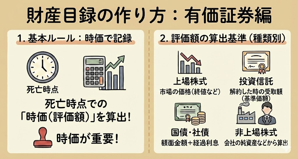 2. 財産の評価は、被相続人の「死亡日時点の価額(時価)」を基準に記録する。