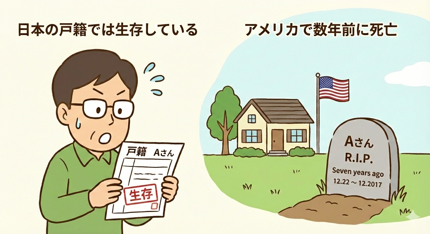 これは、アメリカで亡くなった事実が、日本の役所(領事館や本籍地)に届け出られていなかったために起こる現象です。