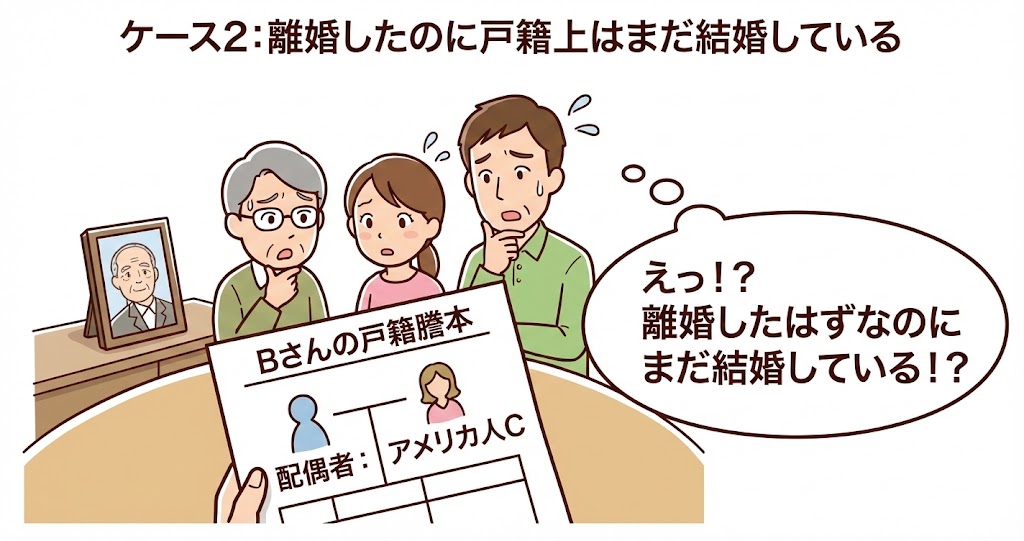 ところがその後、Bさんはアメリカの方式で正式に離婚したにもかかわらず、その離婚の事実を日本の役所へ届け出るのを忘れてしまっていました。結果、日本の戸籍上は「婚姻が継続している」状態のままとなってしまったのです。
