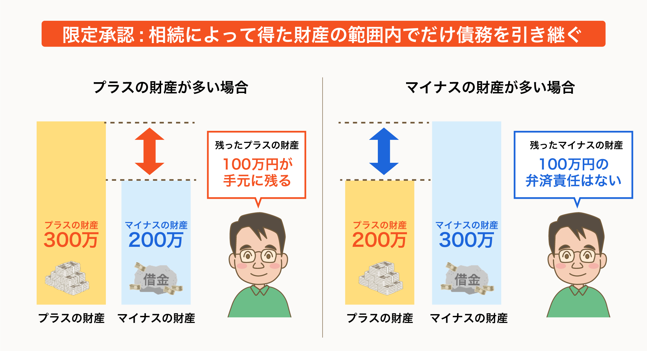 例えば、遺産を調べたらプラスの財産が300万円、債務が500万円あっても、300万円の範囲で返済すれば、不足分200万円は返済しなくてもよいことになります。